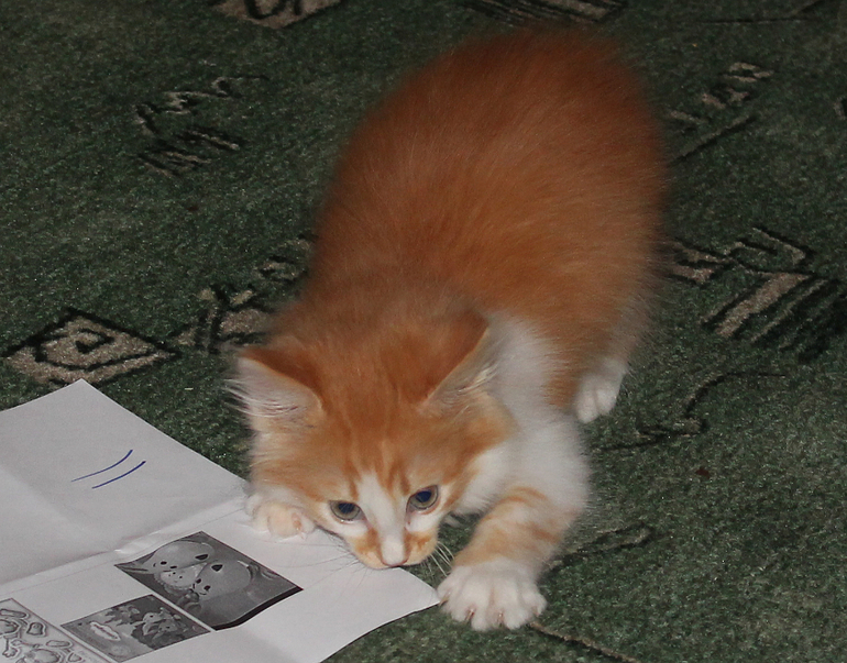 Персик растёт и радует (а иногда расстраивает) нас каждый день. Радостей от него больше конечно, он такой игрулька и красавец, налюбоваться им не могу, к лотку приучился за неделю, но приходится немного рвать газет в наполнитель, засыпала без них и Перс делал лужи не в горшок, теперь у нас два лотка я их постепенно смещаю в сторону ванны, потому как поставила их на кухне под стол, т.к. котик начал туда ходить в туалет. Первую неделю он ходил по большому раз в три дня и громко мяукал при этом, запор что ли? хотя кушает в основном супчики, молочко, стул у него наладился пару дней назад, ходит по 1-2 раза за день, но орать не перестаёт, а потом так усердно всё это закапывает, что обрывки газет разлетаются по кухне.