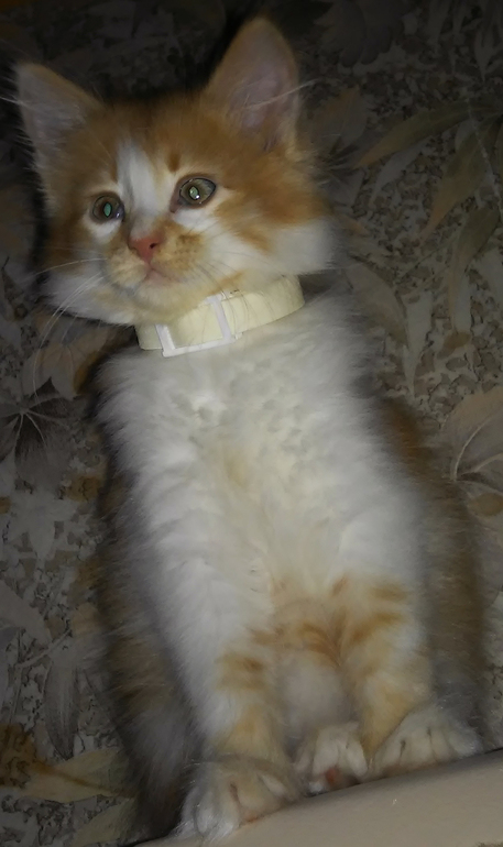 Капли от гельминтов купила и уже проглистогонила его, но мне всё таки кажется, что их у него не было. Купили шампуньку от блох, помыли в воскресение котёнка, особо он не вырывался, но чесаться не перестал и мы купили ошейник от блох, и вот вчера случилось расстройство из-за этого ошейника, я с ним игралась и не знай как получилось, что он попал Персику в рот, кот в шоке, нам не даётся, чтобы помогли, кричит, царапается и прыгает, как кузнечик по всему дому, кувыркается, я сначала его одеялкой туловище накрыла, чтобы не царапал и не вырывался, думаю сейчас ему помогу, а он орёт и пытается ещё меня как-то укусить, я уже чуть ли не плачу, так жалко его, бегу в ванну за ножницами, и он как-то выбрался, я его на ручки, а у него сердце колотится и взгляд такой напуганный, долго мы потом с ним обнимались. Ошейник ещё немного затянули, на нижнем фото ему на шею не давит, он пушистый очень и кажется, что ошейник впритык.