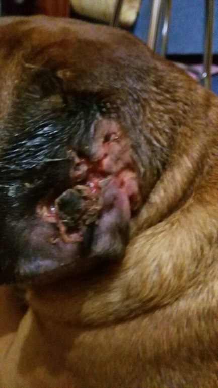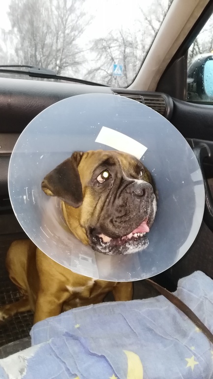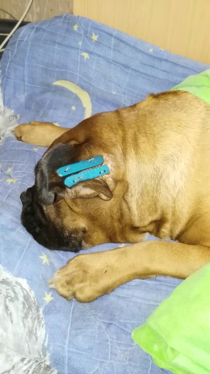 Операция длилась 40 минут. Ветеринар решил вместо многочисленных швов наложить пластины на ухо с двух сторон и скрепить их скобами. От общего наркоза мы отходили очень тяжело. Было недержание мочи, долго спала, потом блудила по квартире, были галлюцинации - что нас сильно испугало.
