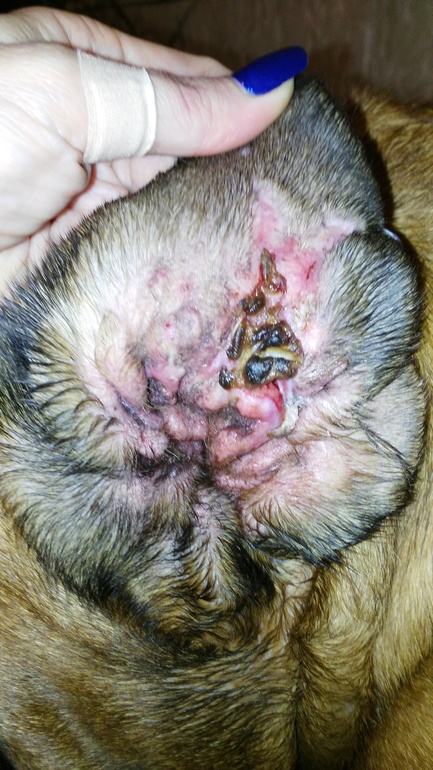 У нас проблема с ушами у двоих боксеров. В этом году умерла мама Дэйзи, Лайма, наша первая боксерша. У нее такая же проблема была. Но вообще началось все с зуда.Лайма была аллергенной собакой. Ни раз ее раздувало, как шарик. Потом методом проб и ошибок поняли, что у нее аллергия на рис. Когда начали кормить кормом Хилс (противоаллергенным), аллергия отступила.