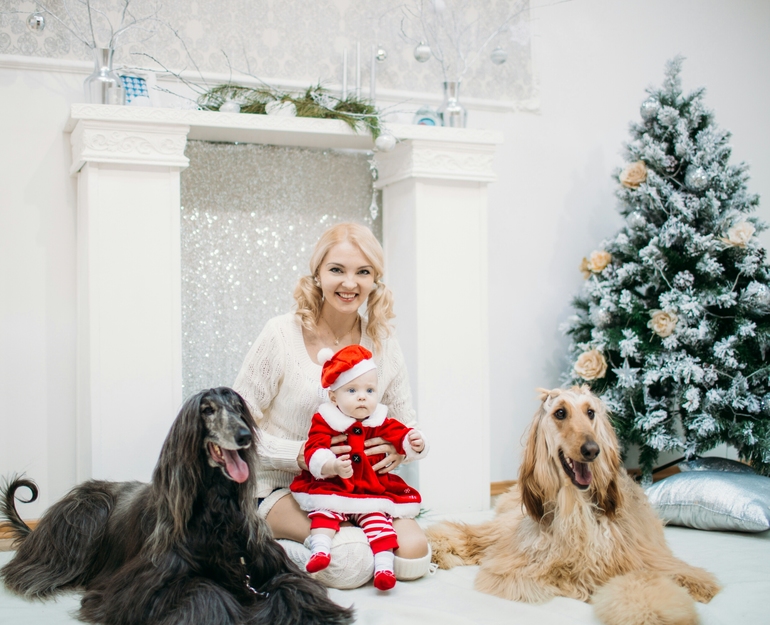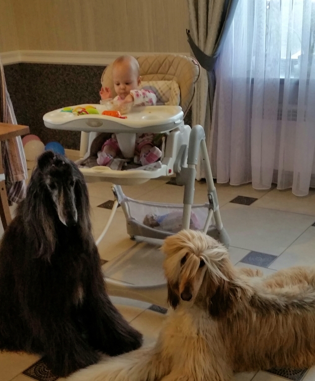 Со временем собаки не только приняли,но и полюбили дитя. Всегда интересуются ею.