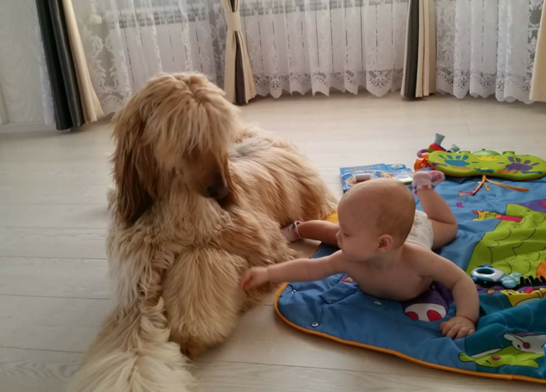 Пелагея,получается общается с животными(собаками) с рождения. Так как к моменту ее появления собаки в доме уже были.При чем последний появился во время моей беременности. Когда мы с дочкой приехали домой, собаки конечно сначала отнеслись с осторожностью. Но уже с первых прогулок я начала потихоньку приучать их.Сначала тихо сидеть рядом,охраняя сон ребенка.