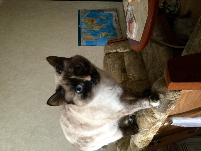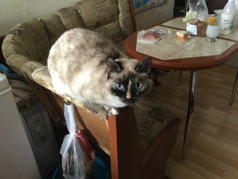 Её очень маленькую и братьев/сестёр выкинули на лестничную клетку в мороз, свекровь подобрала и отдала нам. Более чистоплотной, деликатной, но очень пугливой кошки я не видела... Таких растить и растить. Будет даже огромный кусок мяса лежать, никогда не тронет.