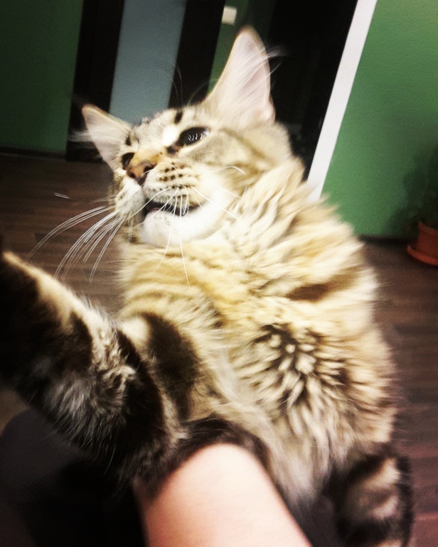 Я обожаю его характер. Он очень скакучий, может выскочить из-за угла с распушенным хвостом или просто сидеть на месте, потом подпрыгнуть на метр вверх и понестись с заносом в поворотах. Но агрессии вообще 0. Ребенок его затискивает, но кот все-равно к нему лезет. И еще он всегда с нами - спит, ест, тв смотрит.