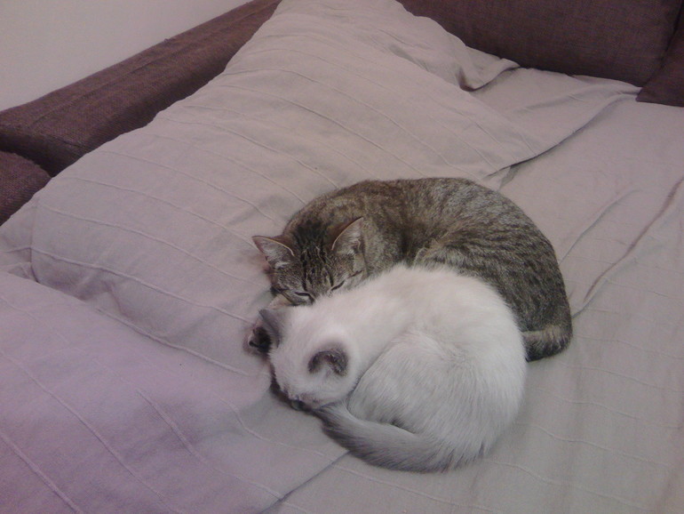 и правда полюбили их уже, подобрали- кошку на улице,под балконом сидела, и котик около двери под ноги бросился (ох уж этот первый этаж))) гости приходят кот с рук не слазит,очень ласковый. А кошка такая независимая вся,любит сама по себе быть. Но вместе и едят и спят,и бесятся,даже бывает в один лоток одновременно садятся)))