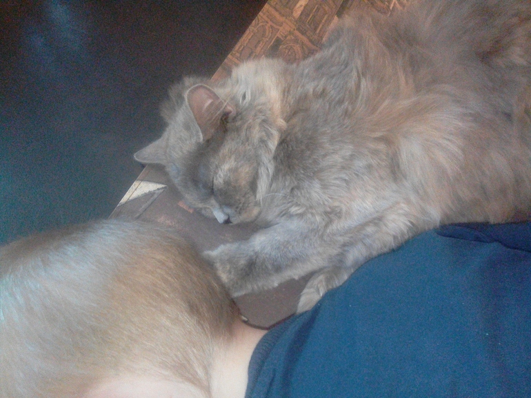 Это они обнимались и заснули . не понимаю в породах . но она красавица.