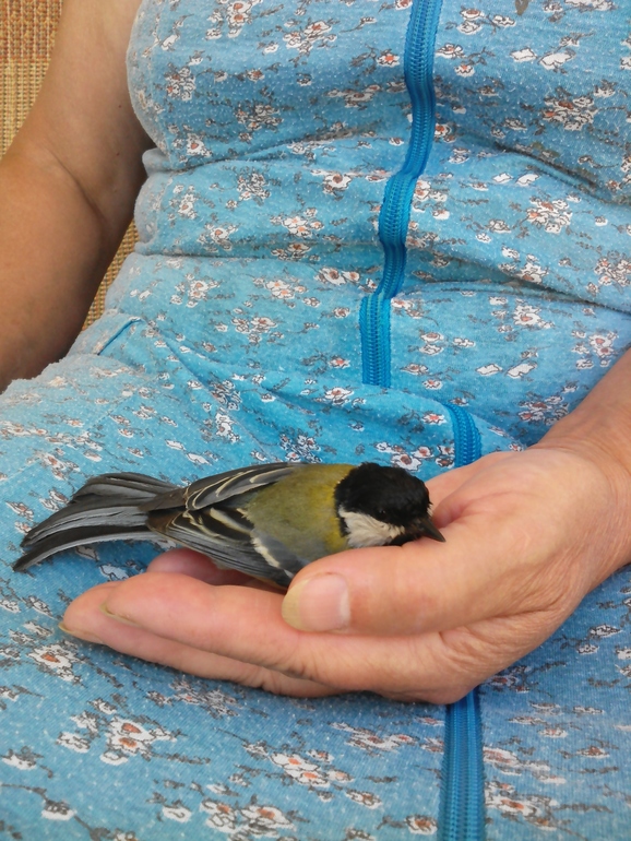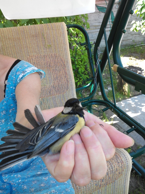 Синица. Довольно взрослый слеток уже. Посадите в кустик какой-нибудь и родители его через какое-то время заберут.
