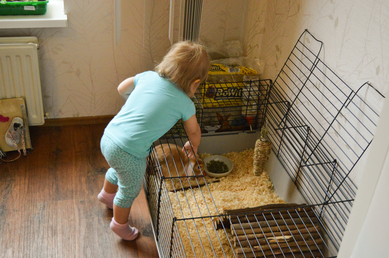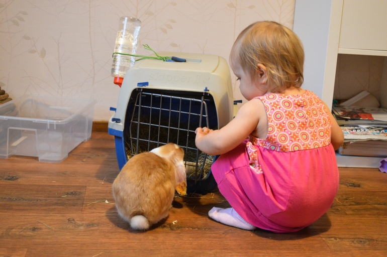 Спустя неделю этот хитрюга научился выламывать дверцу переноски и устроил себе свободный выгул ещё и по ночам. К моему удивлению, он ничего не погрыз, нигде не наделал делов - в туалет ходил у себя в переноске. Но клетка уже была оплачена, так что я решила, пускай ночует в ней, а днём прыгает по дому или пасётся на газоне, если погода хорошая.