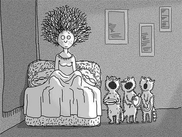 Моя сидит молча, пока я сплю, а как увидит что глаза открою такое и начинается, а во дворе собака на голове ходит и в окна заглядывает😁