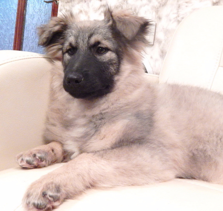 Фанни. Полудлинношёрстная, зонарного окраса (подшёрсток белый), игруля и заводила. Очень ласковая, как кошка, обожает сидеть на руках. Вырастет небольшой, сейчас она ниже колена, весит 9 кг. Аля, мини кавказская овчарка :)