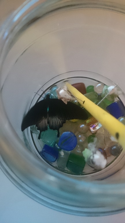Положите на красивые камушки мокрую марлю или хотя бы носовой платок чтобы была влажность. Всем бабочкам места в баночке не хватит, если они будут сидеть на дне;)