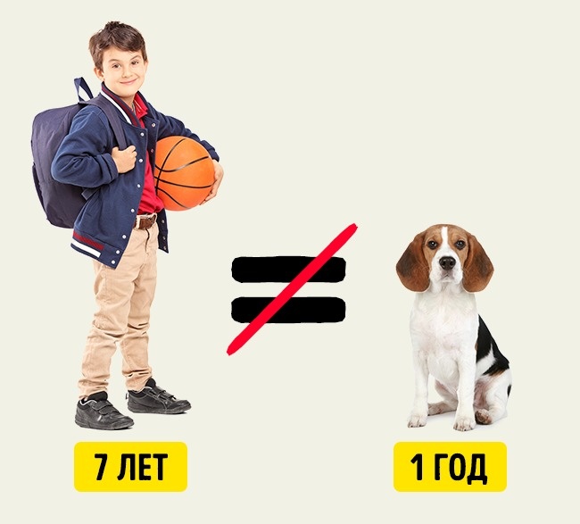 Среди хозяев собак бытует мнение, что один год жизни собаки равен семи человеческим годам. Однако ученые отметили тот факт, что собака к годовалому возрасту достигает половой зрелости и готова к продолжению рода. Человек же достигает половозрелого возраста примерно к 15 годам, но никак не к семи.