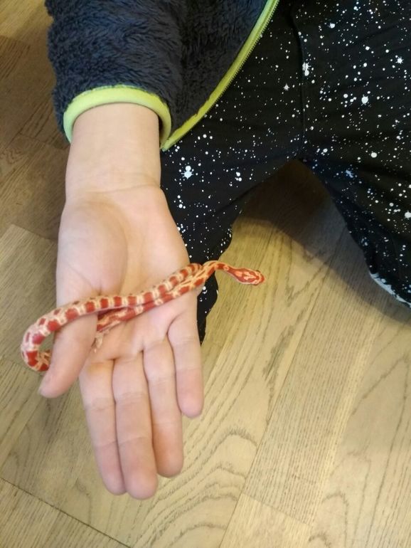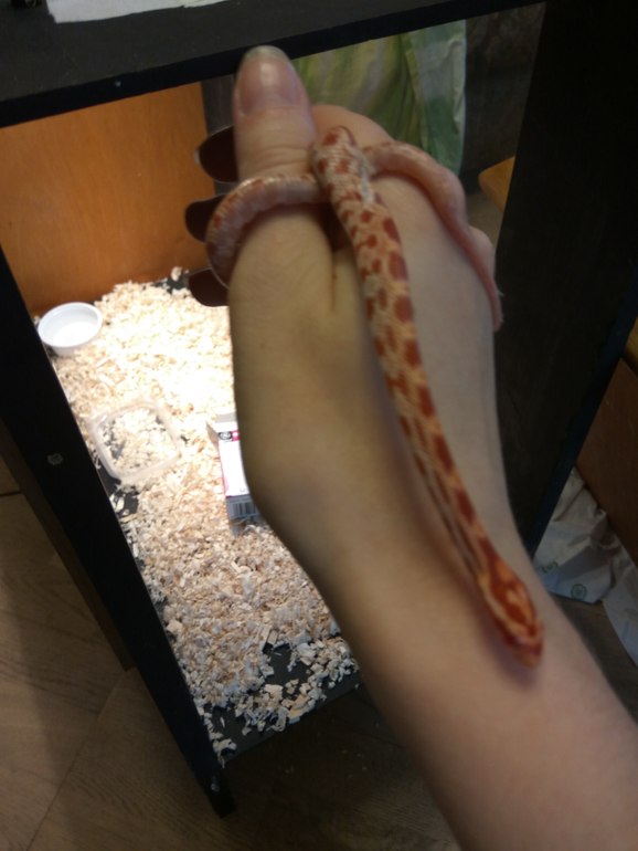 Подрос сильно, уже прям солидная змея :) как питомец удобный. На отпуск можно спокойно оставлять, две недели не есть это нормально)) но я как-то не впечатлилась. Лежит и лежит :)