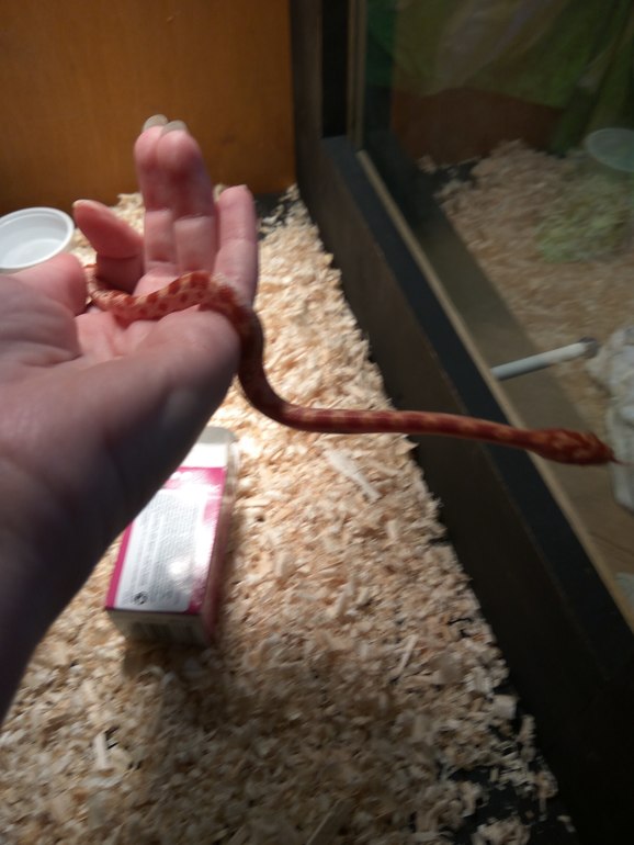 Пугливый - обморочный или просто пытается уползти? Хорошо, что не агрессивный, это уже понятно с рождения. И кушает сам, что тоже прекрасно. У тех альбиносиков маисовых, которых я видела, примерно половина есть не сразу научилась.