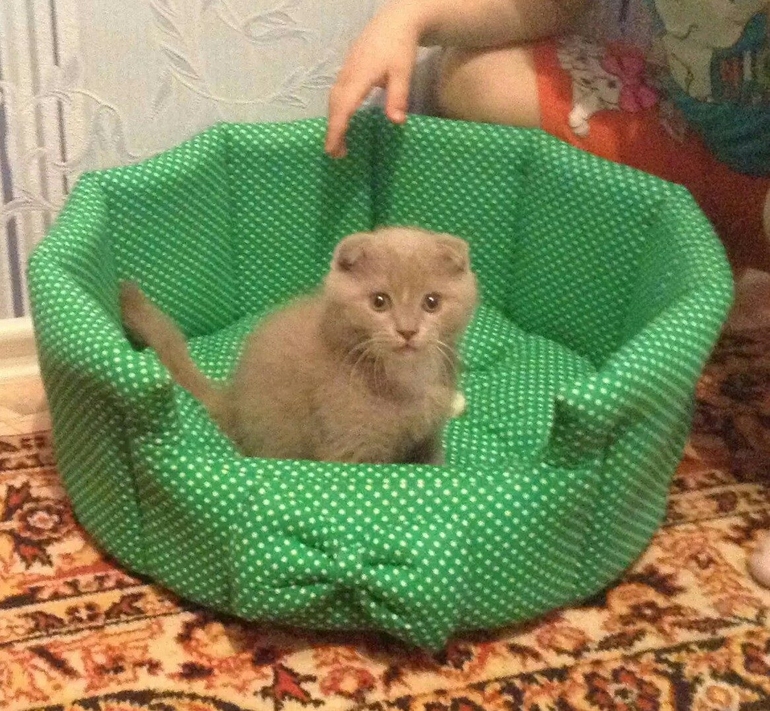 Заказала у Наталье лежанку, и к 8 марта лежанка была уже у нас. Наша киса сама легла в лежанку, когда я ей вечером распаковала, сразу решила, что это её, хотя у нас ещё большой кот есть.