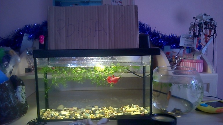 Табличка, как в зоопарке. Чтоб никто не спутал. Это рыба! А не что-нибудь... вдруг кто неправильно поймет. Это младший подписал. Это ЕГО рыба. личная. на день рождения подаренная и выжившая (если кто помнит этот хоррор).