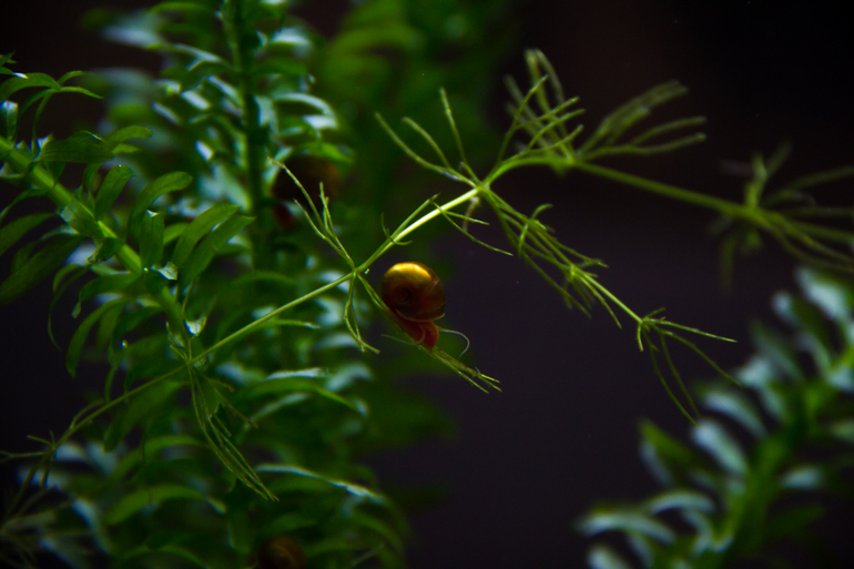 Хотя, лукавлю ж. Он не один живет. С улитками катушками. Они тоже прибыли с водорослями живые, красивые здоровые. Я сначала обрадовалась. Санитары ж водоема.