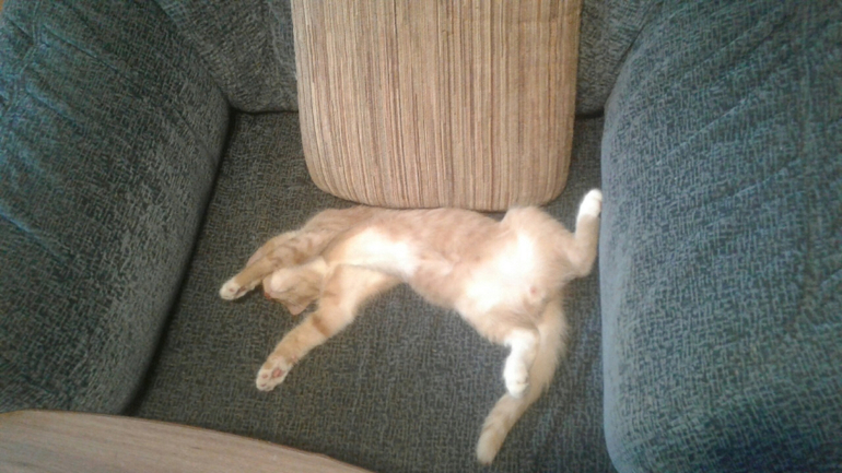 Лапка зажила полностью,но видимо,срослась как-то не так,когда садится,подворачивает ее коленом к полу и лапка торчит из-под кота.Ну,вроде неудобств ему это не приносит.