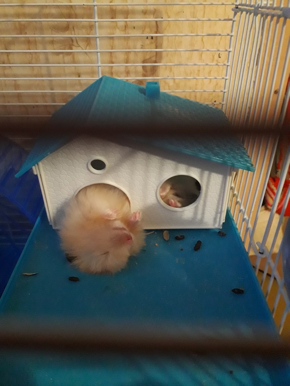 В домике куча мягких салфеток, в уголке запасы еды, а для него места не осталось. Я в его хозяйство не лезу со своим уставом) Я сняла его утром после вечера и половины ночи любви с Годзиллой - подружкой. Так улюбился, что и на голом пластике сопит.