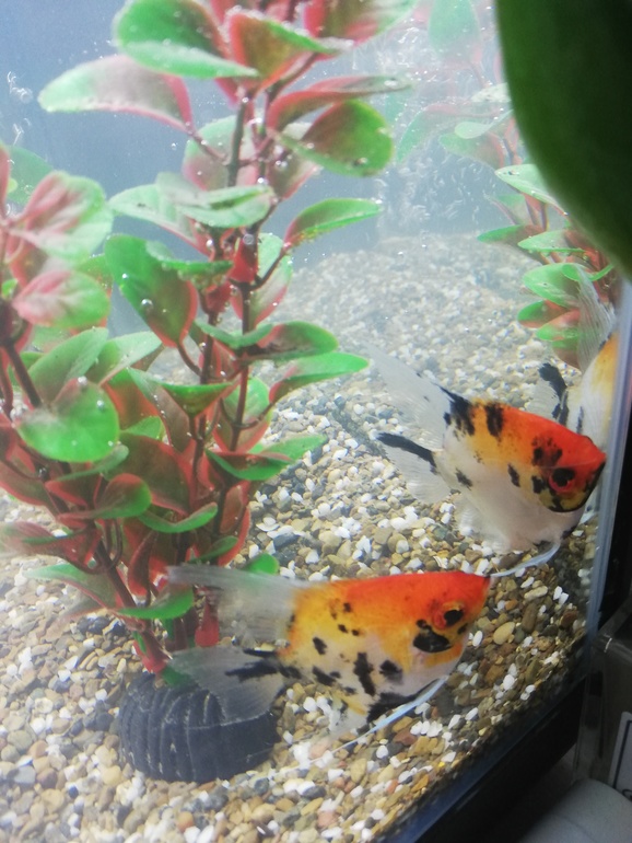 У вас рыбки.Скалярии кои.Для 1 такой рыбки нужно 50литров воды для2 х100литров.Для того чтобы уточнить обьем аквариума необходимо на любом сайте аквариумистов воспользоваться калькулятором обьема.Вносите Д.Ш.В. и получаете обьем.Если обьем воды для рыбки недостаточен то рыбка будет болеть,замедлиться в росте(это искривление позвоночника,деформация внутренних органов.)и погибнет.Скалярии достаточно контактные и разумные рыбки,они постоянно выпрашивают еду.Перекармливать их нельзя иначе у них выпадает кишечник.Выключать фильтр нельзя.