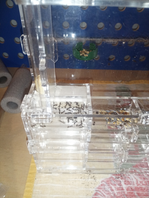 Семья разрослась знатно, на днях открыли следующую часть муравейника. Корма, который в наборе хватит на пару лет, 1 раз в неделю даём растительный белок (прям крошка курицы или рыбы обдать кипятком и дать). Наблюдать за ними очень необычно - яйца отдельно складывают, матка прям большая (~1.2см), рабочие муравки суетятся. Корм разобрали по виду зёрнышек и разложили по разным местам. Мусорка у них организована в дальнем углу, чистюли. Сын следит за влажностью (колбы должны быть полными) и водой. Хлопот не доставляет, оставляли на 2 недели летом - всё отлично. В принципе интересная покупка.