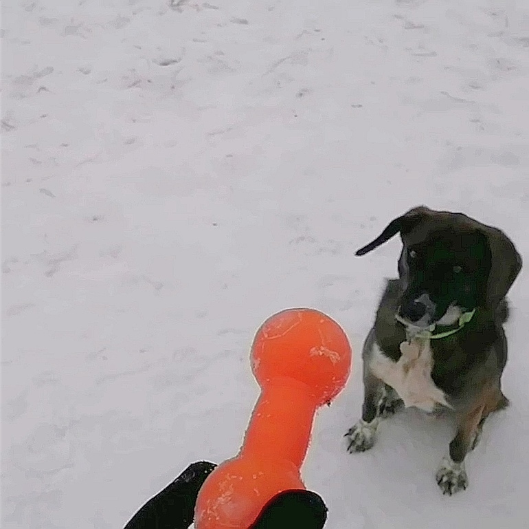 Вообще эту игрушку он не особо признал сначала, купила я её вместе с тем канатом. Но пару вечеров он за ней весело цокал по ламинату - видимо, моменты особого веселья. Выпал снег, и я узнала, что это абсолютно зимний пёс, скакать готов до утра. На идею взять гантельку Рэй сам намекнул, схватил палочку и просто начал с ней носиться) Никогда за палочкой не бегал, а тут я ему кидаю - а он несётся за ней!