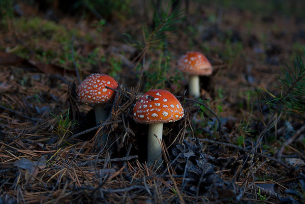 Фотографию с мухоморчиками чуть-чуть осветлила с помощью уровней, но не уверена, что мне вторая картинка больше нравится.