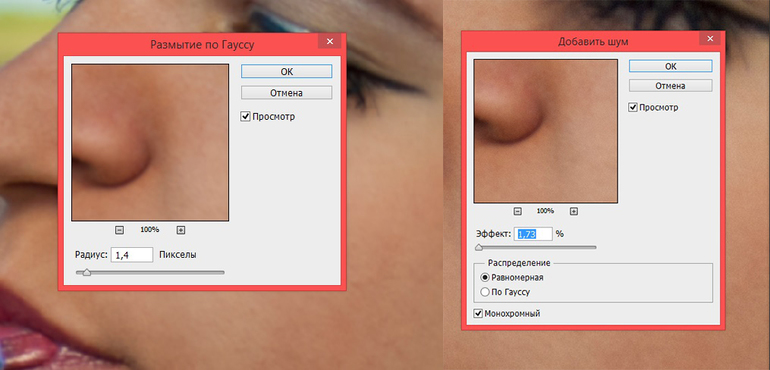 Хорошо сделанный шаг 1 поможет выставить минимальные значения размытия. Затем, не снимая выделения кожи, добавляем немного шума (фильтр-шум-добавить шум). Здесь вы можете поэкспериментировать и возможно «пыль и царапины» для создания правдоподобной текстуры кожи вам больше подойдет. Возможно использование фильтра «Цветовой контраст» для создания большего акцента на краях и для увеличения резкости (если ваше фото в этом нуждается).. Не забудьте проверить, чтобы были четкие реснички, переход тени и прочее.. Обычно я в слое с ретушью прохожусь смело "ластиком", затем дублирую все слои, объединяю и получается полноценный общий слой.