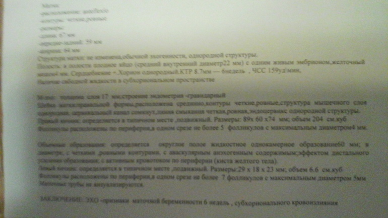 Подскажите пожалуйста. Была на узи, в заключение написали 6 недель маточной беременности, субхориональном кровоизлияние. Наличие свободной жидкости в субхориальном пространстве. Хотя симптомов кровотичения и болей у меня нет. Бьли были только тогда, когда врач проводила осмотр, а на следующий день делали узи.