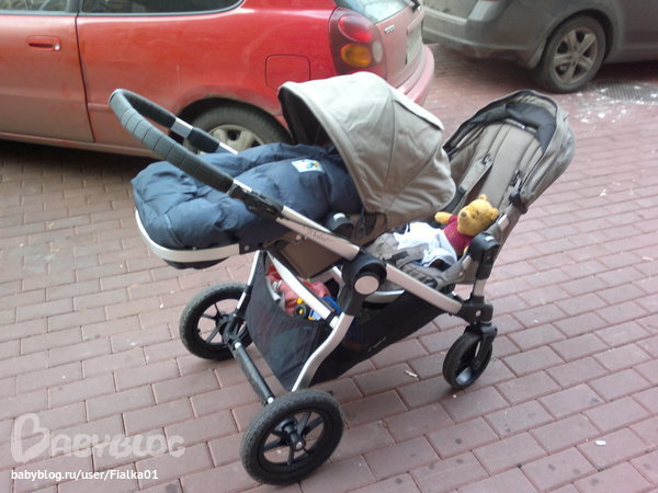 Не всегда это было удобно, но значительно лучше чем вылавливать из песочницы старшего и тащить его на руках и катить одинарную коляску. Но так как я колясочный маньяк, захотелось мне на зиму что то нового. И что бы старший сидел повыше, а то с нашей слякотью Фил у меня как то не вяжеться. И заказала я себе Baby Jogger City Select. Шла она по акции, переходники на автокресло и люлька - были в подарок. Люлька нам ужде не нужна, но не отказываться же, тем более что цена была очень приятной и цвет тот что и хотелось.