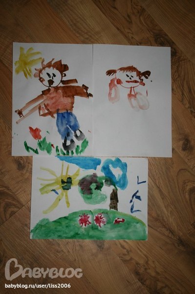 А еще у нас большой прогресс в рисовании, появилось тело и все из него вытекающее, выкладываю наши достижения из последнего, круги для головы рисовала я так она еще тонко не может, а остальное все сама))))