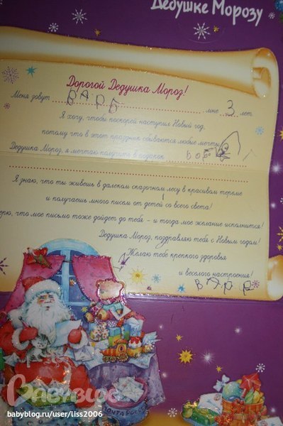 Наши детки (развитие, успехи, фото)Мы уже во всю готовимся, ну там идеальное поведение порядок и тому подобное. дети ждут. Часть подарков выбирали сами, часть будет сюрпризом. Сели мы вчера со старшей писать письмо деду морозу, вот что у нас получилось))) Проблема у нас пока только с буквой я, но я считаю, что она достаточно сложная. В пожеланиях мы рисовали карету с лошадями.