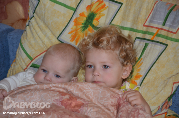 Расстилаю постель, кидаю туда нытиков, всем по порядку даю шоколадку, в каждую лапку даю печенюшку (да, прямо в постели! крошите, родные!), включаю мультики. Вуаля, тишина и покой. Одеваю всем подгузник. Все обнимаются, все счастливы, потом жуем виноград, пьем чай с сушками. И детей как подменили! Началась такая идиллия! Я ТАК расслабилась! Мы поиграли в кучу маленьких игр, которые придумывались сами на ходу: в кучу малу, в прятки игрушки под подушкой, одеялом или простыню, а Лиза угадывала где она, в ку-ку под одеялом, в норку и чудище - Настя была чудищем и лезла к Лизе в норку (под одеяло опять же). Ну чем не волшебный предмет - одеяло??? Мы все дружно смеялись от души, а я забила на ВСЕ. Перепачкались, переоделись и еще по разу. Простынь в стирку. И ничего страшного не случилось. Потом дети стали играть сами. А я потупила в телевизор и чуть пофотографировала.