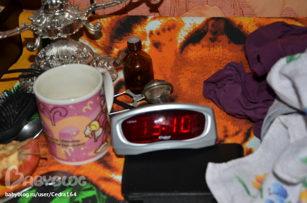 На часах 13:10, а у нас дети нечесаные, в памперсах, валяются сами по себе, негуленные. А еще на фото видно, как лишний хлам сбежался на комод, тут и чашка моя с сеточкой, и бутылочка персиково масла, расческа лизина, так и осталась без применения, погрызанное яблочко, и одежка, и хард с мультиками. Как же оно все быстро захламляется. А во что кухня превратилась!!! Хе-хе, фото не будет, это интим.