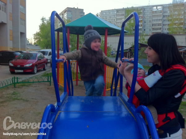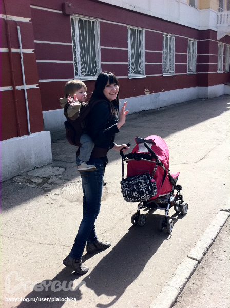 Иногда мы просто гуляем пешком, младшую к себе, старшего за ручку, иногда если идти достаточно далеко, то старшего в коляску, младшую в рюкзак, он там и спала и ела без отрыва от меня:)