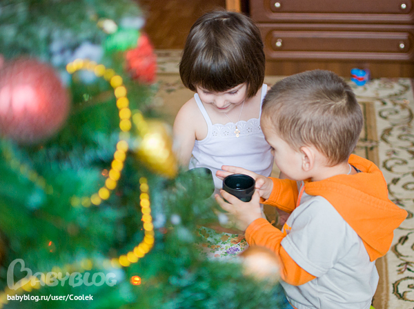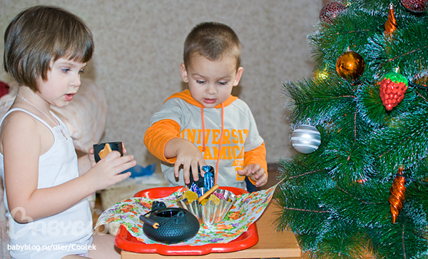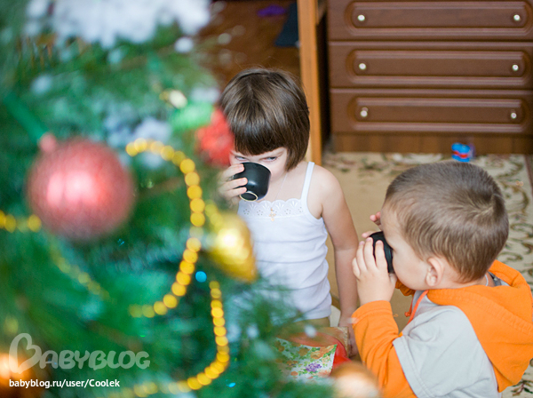 Посудка у них в игровой самая разнообразная. Есть пластмассовая, есть керамическая. Я разрешила взять чайный китайский набор, подаренный мне подругой на свадьбу и устроить чаепитие прямо у елочки в комнате.