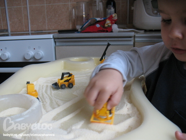 Купили эти машинки в ашане набор из 6 машинок 250р. Играть с ними просто так не интересно. Вот я и насыпала Мише манку вместо песка. Играл весь день так что зауши не оттащить.