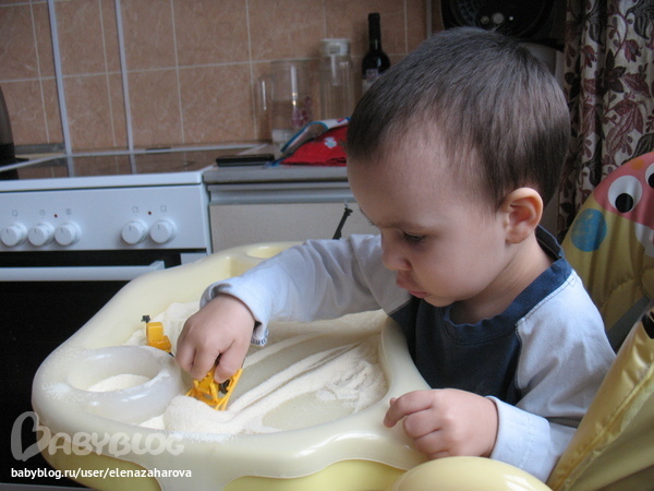 Классно придумали! У меня дочка вот любит с крупой играться ))) Фасоль, рис, перловка и мисочки, кружечки и ложечки, все это на подносе ))) она пересыпает все, ложечкой перекладывает ))) самое усидчивое занятие у нас! Потом правда надо пылесосить, но это тоже забава ))))
