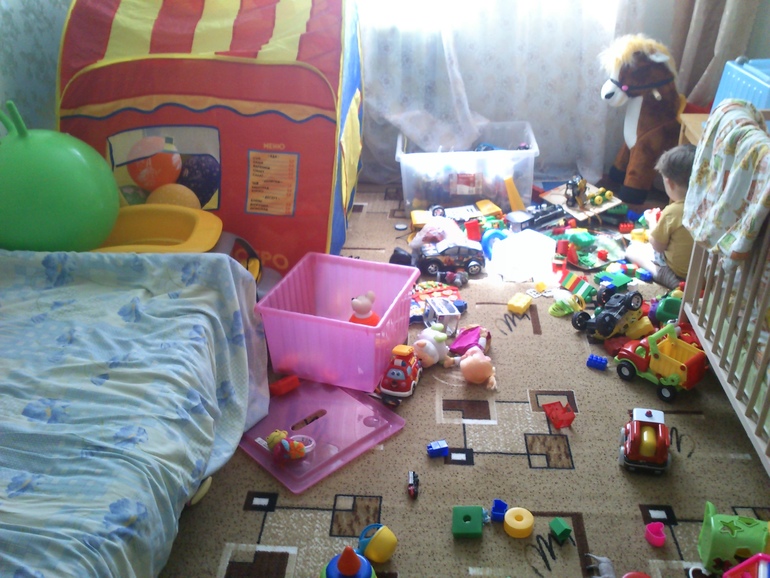 Игрушки рассортировать по ящичкам или хотя бы пакетам. Поиграли в конструктор - собрали, достали посудку - покормили кукол - убрали, достали машинки и т.д. Собираем вместе. Бардак, конечно, случается. Но чаще, если я либо расслабуху себе дала и просто забила на все или если в доме чужие дети.