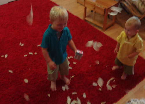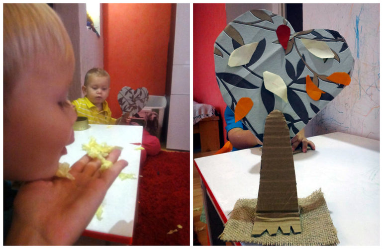 Деревья парней заинтересовали, даже оба пытались клеить, но младшему быстро надоело и переключился в режим «Все ломать». Пока Матвей пытался хоть что-нибдь оторвать у своего дерева, со старшим дело пошло, только листья не смогли сдуть, поэтому воспользовались разбросанными по полу салфетками.