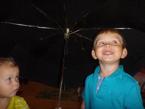 3. Активная игра. «Дождик пошел» Играет музыка - танцуем, звук дождя - прячемся под зонт. Старший затею оценил, играл с большим удовольствием. Младший с радостью повторял все движения, дул как ветер, падал как листик, но увидев зонт, забыл обо всем и уже грозил устроить настоящую бурю. Пришлось эту идею быстро сворачивать.