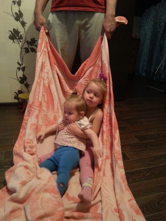 А это, мамка-дурья башка придумала потеху -качаться на одеяле, естесственно детям охереть как понравилось и теперь каждый вечер Альбинка просит качать их с сестрой. Пля, у меня уже руки болят((