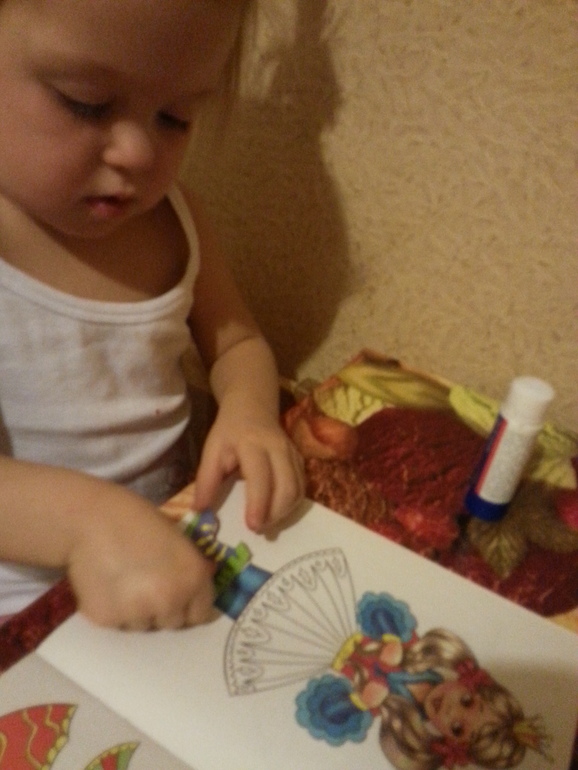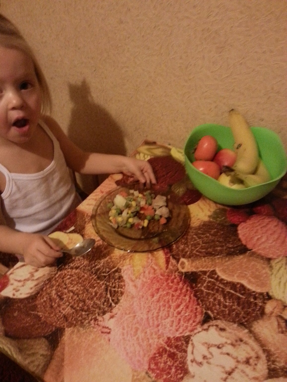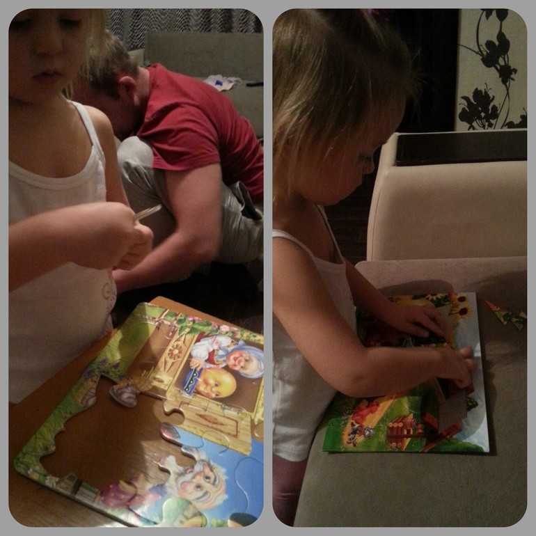 Пришли домой. И тут некогда фотать. Кормлю Кристинку, мою и переодеваю ее. Девчонки бесятся. А я быстро успеваю поесть. Потом приходит папа и ужинает. Дальше Кристинку отдаю ему. А сама занимаюсь со старшей. Выполняем задание с садика. Нужно обыграть стишок про карусель