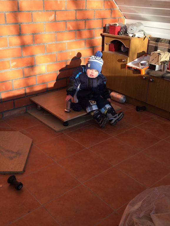 На нашем этаже- балкон. Причем большой. Маленькую можно одеть и поспать сюда вынести. А со старшим посложнее. Чем тут его занять? Есть тут папулины инструменты. Сыну нравится. Но он, наклонясь за ними, чтоб с пола поднять, падает лбом! Хорошо шапка защищает, не больно)))