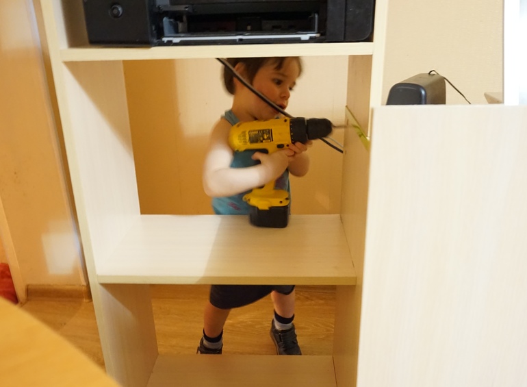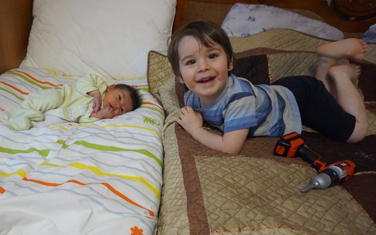 День пятый. Сережка убежал в 9 утра, Леня тоже проснулся в это время. Позавтракали мы с ним, и начали прибираться, между делом подпитывая Вову и меняя ему подгузники. Леня несколько раз выносил за ним меррисы)), такой гордый - старший брат). Вообще, мне показалось, что первое впечатление у Лени на появление Вовочки довольно таки положительное, ведь малыш в основном спит, и я занята Леней. Когда Вова ест, то я так же могу посадить на колени и Леню, или снять его с какой либо высоты, или почистить ему мандарин или порезать яблоко, например. Это с Ленькой я во время кормления первые недели только лежала (сидеть мне нельзя было), чуть позже научилась что-то делать при этом. Сейчас я как обезьянка, Вовку в руку и по делам). Плюс папа в праздничные дни работал чуть меньше, и много времени уделял сыну. Да и Вовочка по прибытию из роддома подарил брату клёвый шуруповерт, Леня с ним почти не расстаётся)).