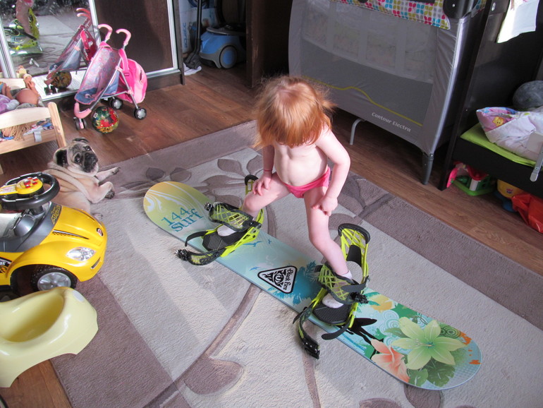 Пока мама читала, как сместить крепления, Софико дорвалась до досочки. В следующем году точно надо на лыжи ставить, тем более вчера на склоне столько маленьких видела с инструкторами. Такие мимими !!!