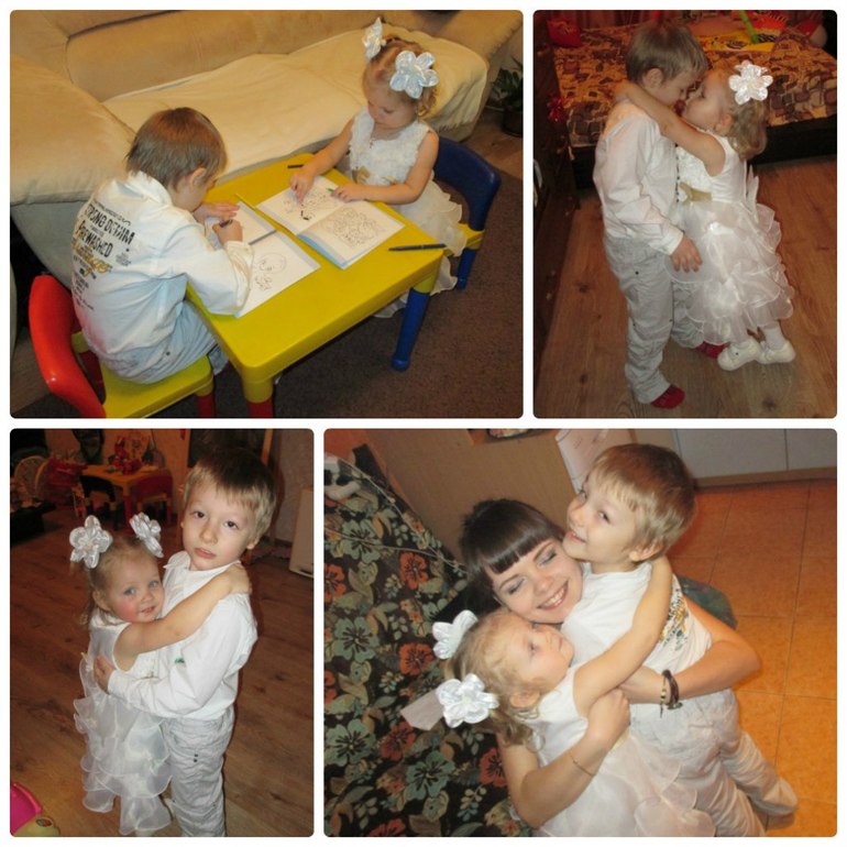 А сегодня я пришла за Настей в сад, а воспитательница говорит:"Настя тут к мальчику Артему пристает!" (и улыбается). Я подумала, бьет что ли? А она:"Она его обнимает и целует постоянно, почти не отходит от него)) Он сначала сопротивлялся, а теперь, кажется, привык, я вам вечером фотографии скину!") Мы посмеялись. Она сказала еще, что остальные девочки сказали, что тоже хотят так, и тоже начали обниматься и целоваться. Дома я посмотрела фотки, они такие милые))) Правда Артем не особо рад, зато Настя прямо кайф ловит!))) Фоток много, сделала коллаж: