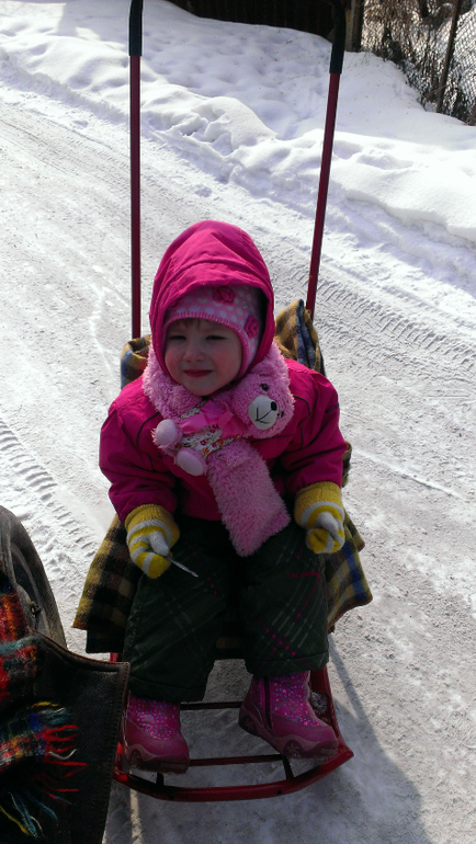 На прогулке. Были на даче у свекрови (просто почему-то их загородный дом называем по старинке дача). Коляску забыли из машины выложить, поэтому Аришка каталась в тачке)) Зато вездеход, да и маме какая физ. нагрузка!
