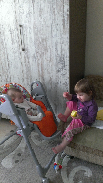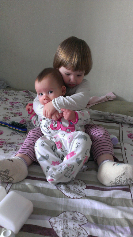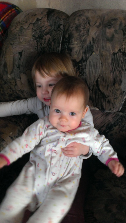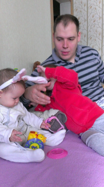 Не знаю, почему, заметила только при написании данного поста, но наши девочки очень мало взаимодействуют, особенно сейчас, пока Аришка (9 мес.) еще не ходит и вообще она ни рыба, ни мясо не лежит, не ходит. И по этой же причине развивающих занятий совместных еще тоже пока нет. Но вот все же несколько совместных фото я отыскала: