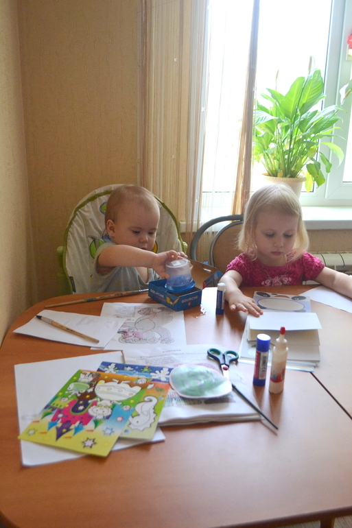 Я сижу за столом,а дети напротив -Кирилл рисует в водной раскраске,а Алёна клеит)![]()